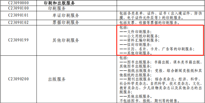 商务服务编号C23000000 , 印刷服务编号C23090000